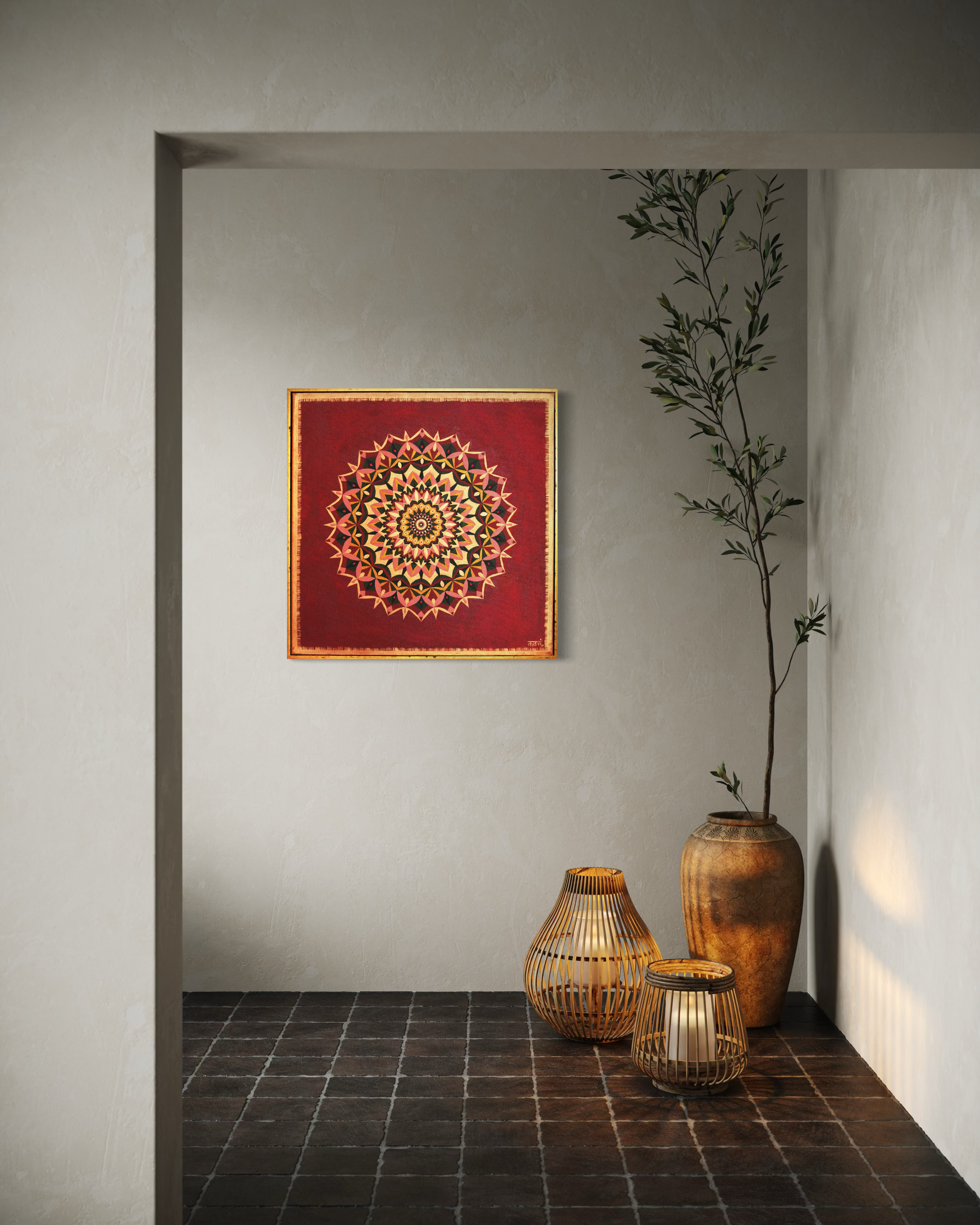Peace emerged during a period when the artist's thoughts felt overwhelming a time marked by emotional unrest and an urgent search for stillness. In response, the mandala became a quiet act of healing. Layer by layer, the detailed patterns provided focus, each stroke creating a sense of order amid inner turbulence. The intricate geometry and floral motifs reflect an intentional return to balance, while the bold backdrop offers grounding and contrast. The artwork is not just a meditation on harmony, but a visual record of transformation from mental clutter to calm clarity.In its essence, Peace is both a personal refuge and a universal offering a reminder that serenity can be shaped, even when it feels out of reach.